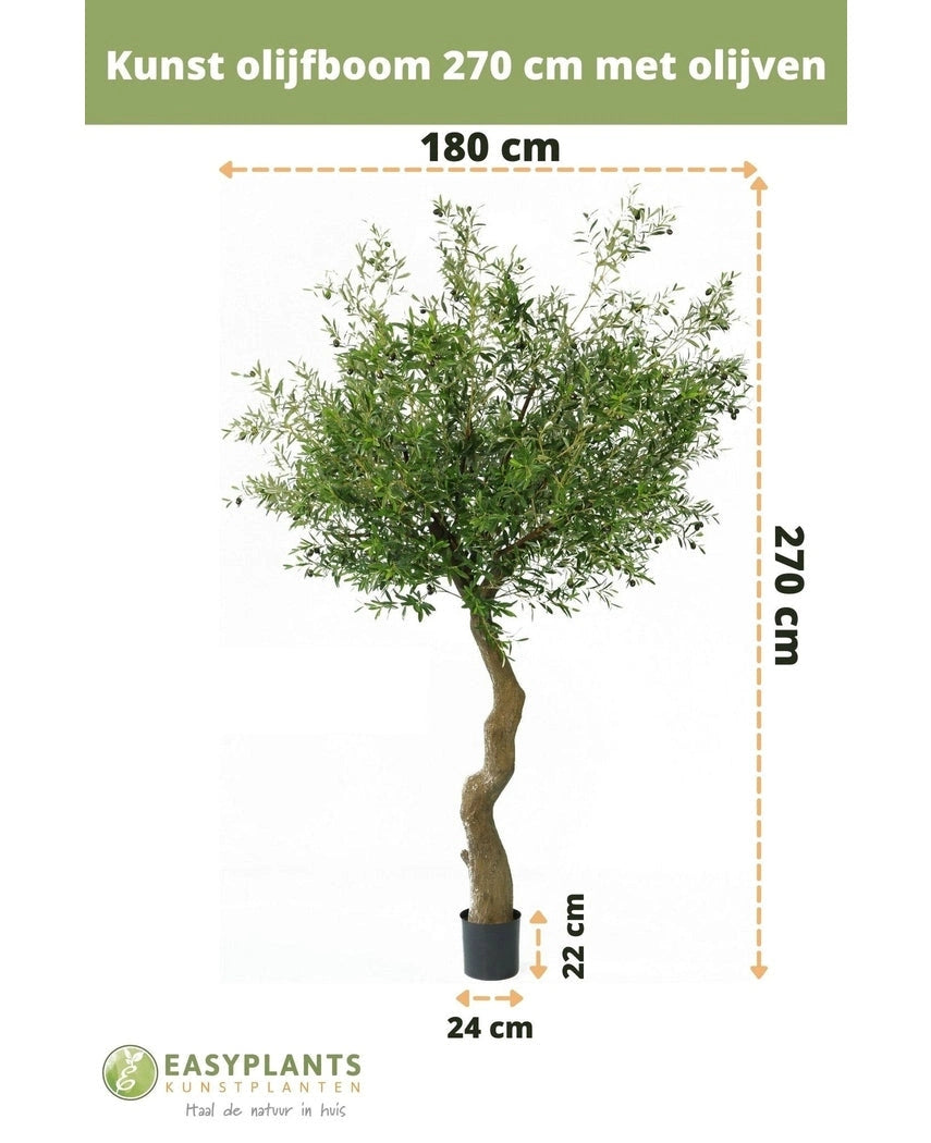 Deze Kunst Olijfboom is een indrukwekkende verschijning uit onze veelzijdige collectie kunstplanten en kunstbomen. Deze mediteraanse beauty met een hoogte van maar liefst 2.70 cm is een ware eyecatcher. De prachtige stam is gemaakt van echt hout en de kunststofbladeren zijn zeer gedetailleerd. Hierdoor is de kunst olijfboom nauwelijks van echt te onderscheiden. De olijfboom is geschikt voor binnen en verdient een mooi plekje binnenshuis. Een verzwaarde voet zorgt ervoor dat de boom niet omvalt. Welke binnenruimte verfraait u met deze fraaie olijfboom?