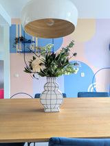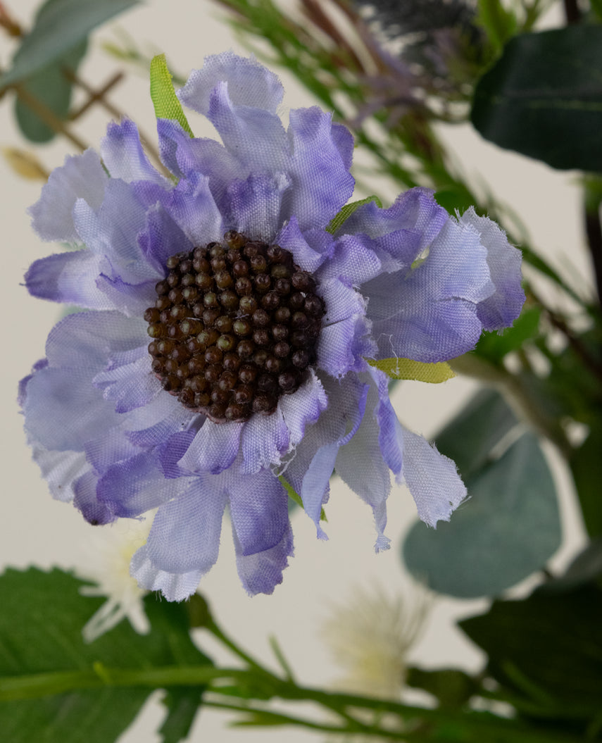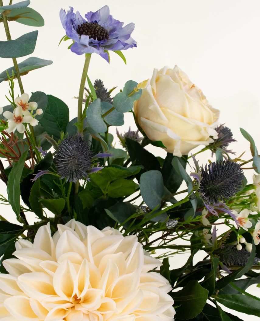 Dit kunstzinnige zijden boeket bestaat uit de weelderige Real Touch dahlia, de romantische Real Touch tuinroos, de verfijnde waxflower, de speelse daisy, de unieke scabiosa, de sierlijke Salix willow, de karaktervolle distel, en de geurige groenaccenten van eucalyptus en laurier. Samen vormen ze een...