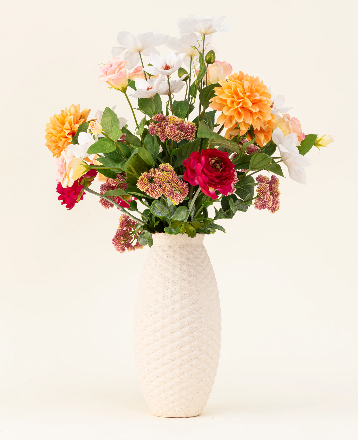 Breng blijvende schoonheid in huis met dit prachtige kunstbloemen boeket, samengesteld uit hoogwaardige bloemen zoals Real Touch Dahlia, Real Touch Eustoma, Sedum, Kantbloem, Delphinium en Ranunculus. Dankzij de Real Touch technologie voelen de Dahlia’s en Eustoma’s levensecht aan – niet van echt te onderscheiden!