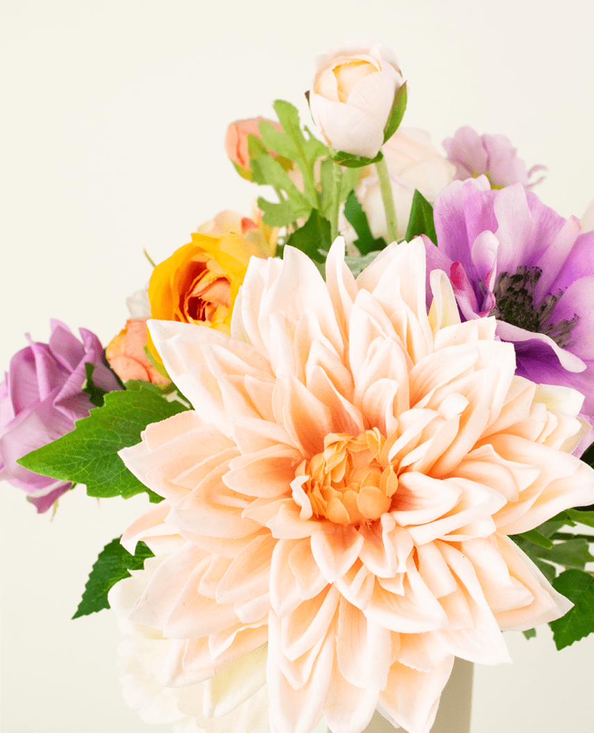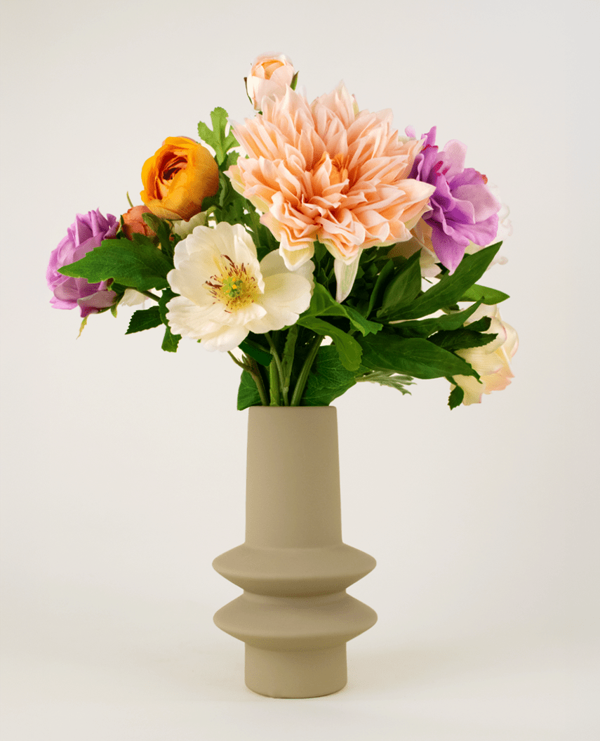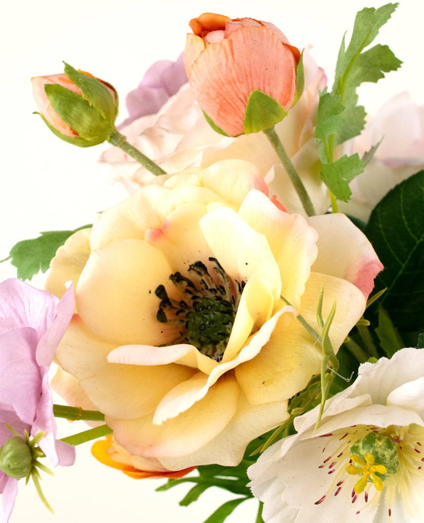 Laat je betoveren door de tijdloze pracht van dit kunstbloemenboeket, samengesteld uit een harmonieuze mix van real touch bloemen die bijna niet van echt te onderscheiden zijn. Van de verfijnde Roos "Emine" en Tuinroos "Anniken" tot de speelse Klaproos en sierlijke Anemoon—dit boeket straalt klasse en warmte uit. De Ranonkel tak, Pioen, Georgine en Rozenkraag zorgen voor een weelderige en natuurlijke uitstraling.