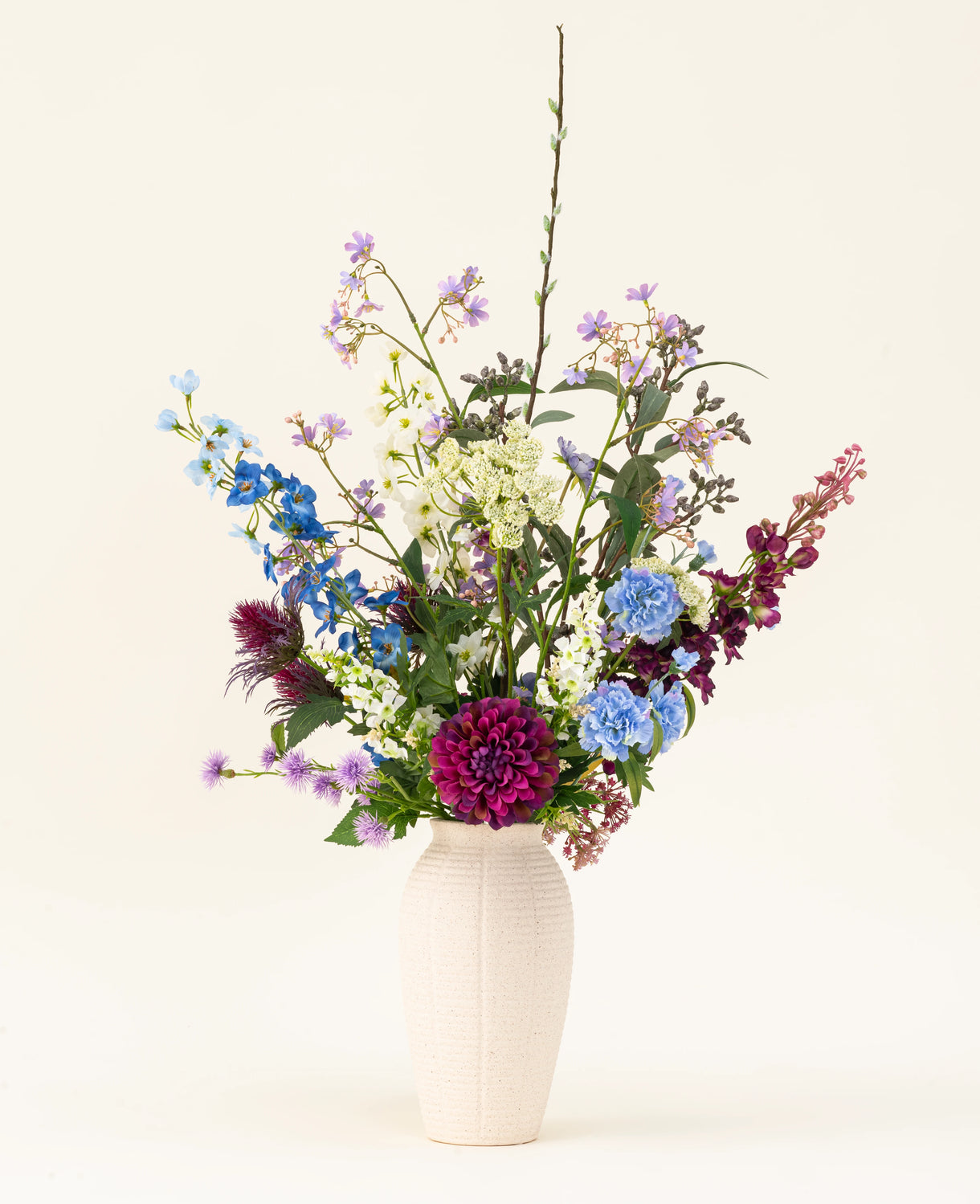 Samengesteld uit een verfijnde selectie van bloemen en takken, waaronder de elegante Anemoon en Delphinium, de sfeervolle Pioen en Dahlia, en de speelse Eucalyptus bes en Statice. De perfecte combinatie van blauw-, paars- en wittonen geeft een stijlvolle uitstraling, terwijl de hoogwaardige materialen zorgen voor een realistische...