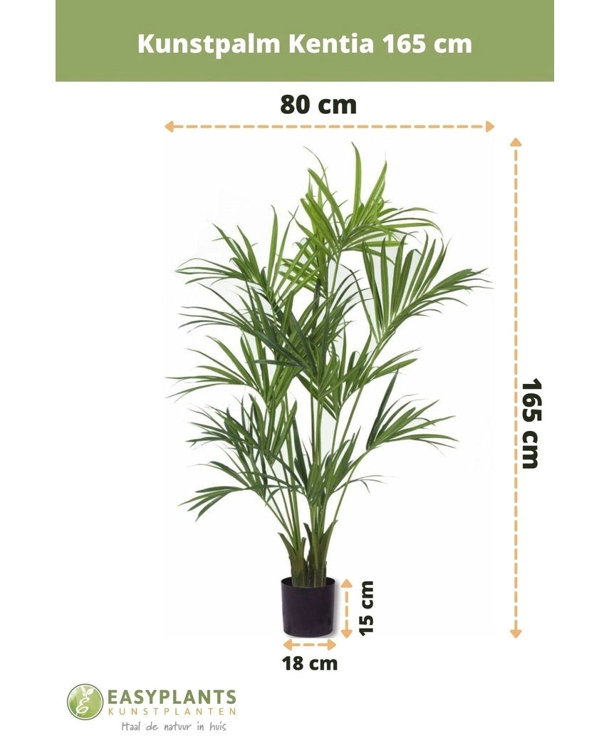 Ga voor een aangename tropische sfeer met de schitterende Kunstpalm Kentia. De Kentiapalm is in de wetenschappelijke wereld bekend onder de naam Howea Forsteriana. Prachtig nietwaar? Mag u snel weer vergeten. Wat u vast niet vergeet is de fraaie tropische look van deze palmsoort. Niet voor niets hebben we deze Kunst Kentiapalm toegevoegd aan onze uitgebreide collectie. De kunstpalm van 1.65 m. hoog is gemaakt van kunststof, bijzonder stevig en bovendien kleurvast. Handig, want zo geniet u zo lang mogelijk van de groene kunstplant. Een erg leuke blikvanger in zowel een woon- als werkomgeving.