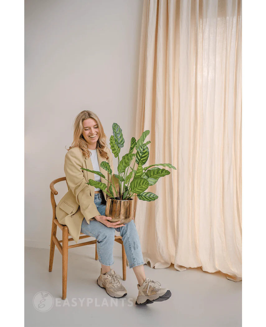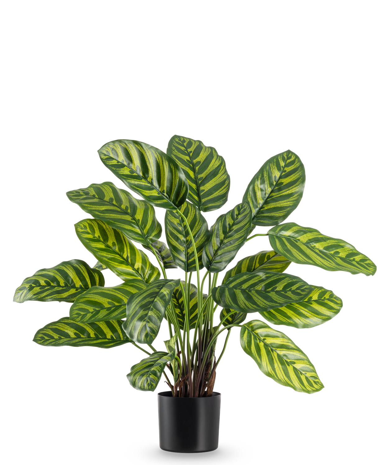 De calathea is een populaire kamerplant vanwege zijn karakteristieke bladeren. De plant komt vooral voor in tropische gebieden en heeft het dan ook vaak moeilijk in ons koude klimaat. Gelukkig geldt dat niet voor de 60 cm. hoge Kunstplant Calathea Makoyana. De ideale kamerplant, want de bladeren blijven altijd groen, vallen niet uit en u hoeft niet met een gieter in de weer. Af en toe afstoffen is voldoende. De kunstplant komt uitstekend tot zijn recht in een hoge design plantenpot en is erg geslaagd in meervoud. Bestelt u er meerdere tegelijk dan krijgt u bovendien een leuke korting. Klikt...