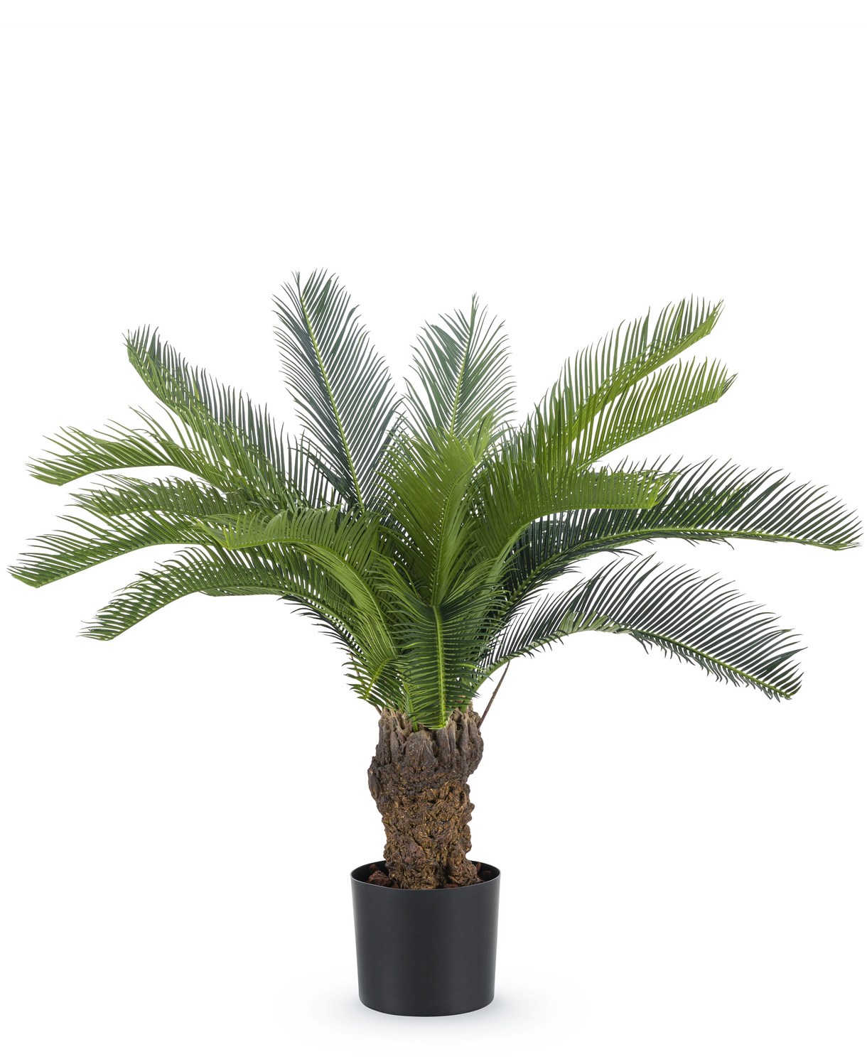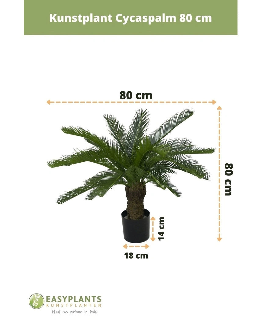 De Cycas palm is een fraaie groene palmvaren de in het echt wel 100 jaar oud wordt. Als u handig bent met een stofdoekje kunt u misschien ook wel zo lang genieten van deze Kunst Palmboom Cycas. Een prachtige kunstboom uit de veelzijdige collectie van Easyplants. De palm is 80cm. hoog en heeft een mooie dikke houten stam. De groene geveerde bladeren zijn gemaakt van hoogwaardig kunststof. De kunst palmboom is geschikt voor binnenshuis en tevens verkrijgbaar in andere hoogtes. Ook zorgen meerdere van deze grote groene kunstbomen overal voor een fijne en tropische sfeer.