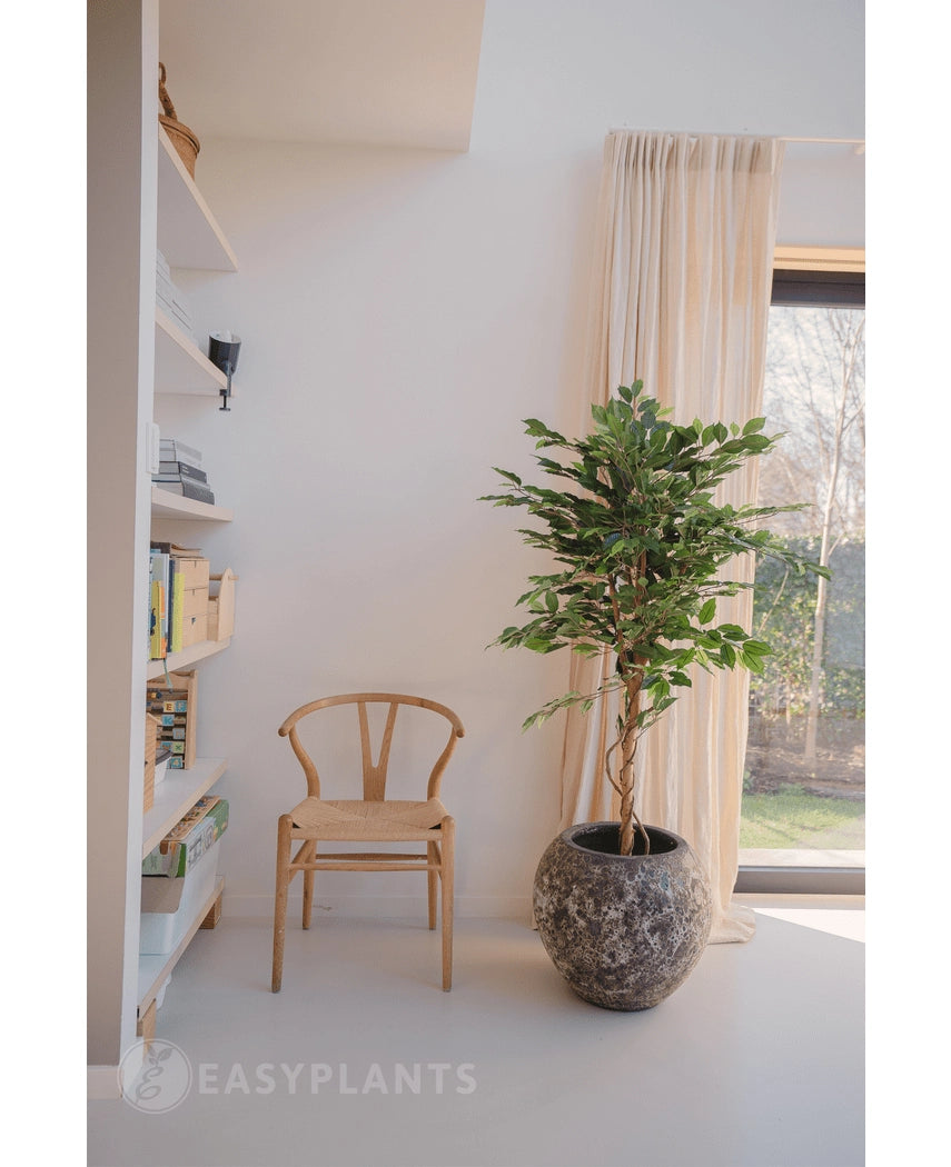 Onze kunstplanten zijn haast niet van echt te onderscheiden. We gebruiken hoogwaardige polyester, terwijl de stammen van echt hout zijn, wat zorgt voor een zeer natuurlijke uitstraling. Twijfel je toch nog over de kwaliteit? Bezoek dan gerust onze showroom om ze zelf te bekijken!