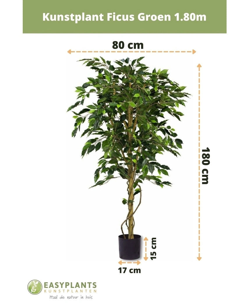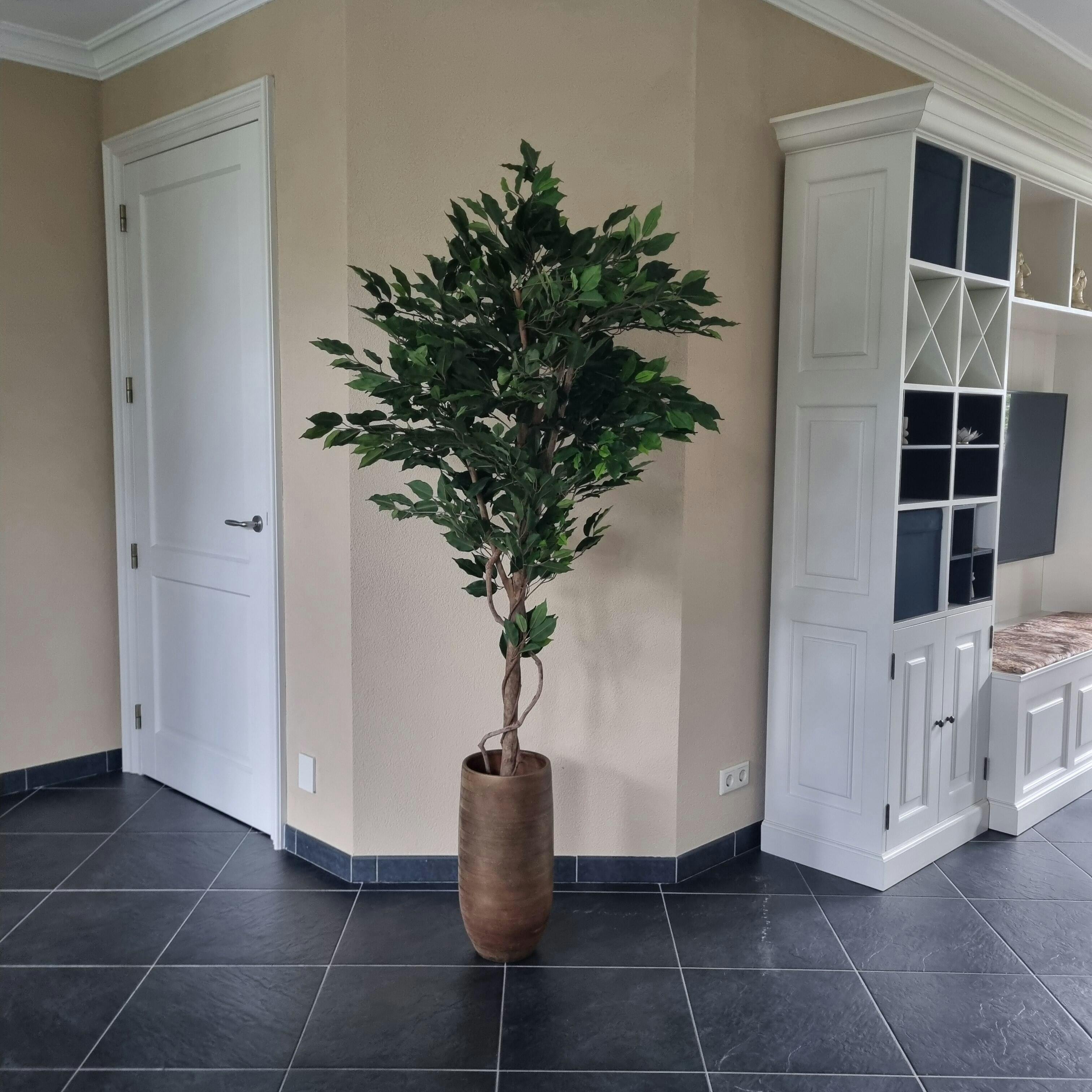 Net als vele van onze ficussen geeft de indrukwekkende 1,80 cm hoge Kunstplant Ficus groen extra sfeer aan iedere ruimte. De plant heeft een mooie volle bos groene bladeren, hierdoor heeft deze prachtige kunstboom een zeer natuurlijke uitstraling. Ook de nerven in het blad en de elegante stam van houten lianen zorgen ervoor dat de kunst ficus er levensecht uitziet. Met een fraaie sierpot maakt u er een ware eyecatcher van. De kunstplant is geschikt voor binnenshuis. Welke ruimte maakt u gezelliger met deze indrukwekkende kunstplant?