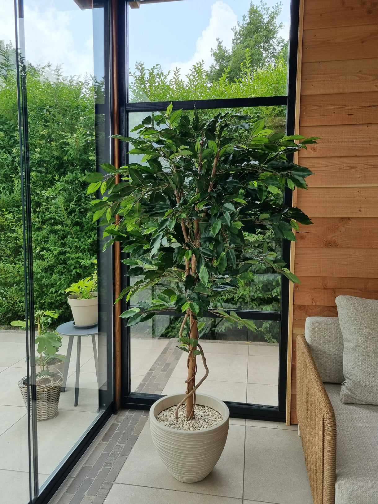 Onze kunstplanten zijn haast niet van echt te onderscheiden. We gebruiken hoogwaardige polyester, terwijl de stammen van echt hout zijn, wat zorgt voor een zeer natuurlijke uitstraling. Twijfel je toch nog over de kwaliteit? Bezoek dan gerust onze showroom om ze zelf te bekijken!