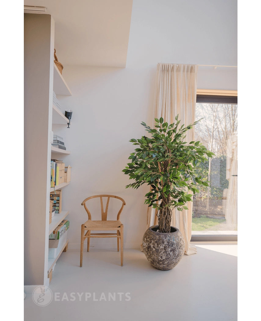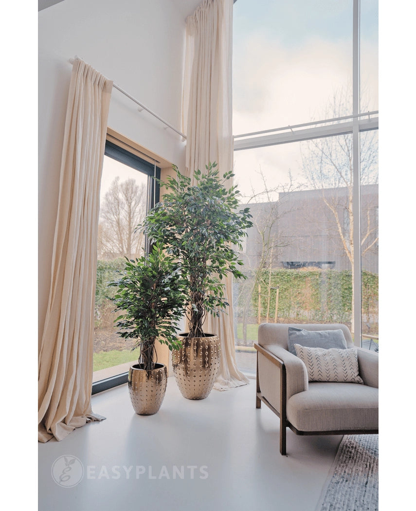 Onze kunstplanten zijn haast niet van echt te onderscheiden. We gebruiken hoogwaardige polyester, terwijl de stammen van echt hout zijn, wat zorgt voor een zeer natuurlijke uitstraling. Twijfel je toch nog over de kwaliteit? Bezoek dan gerust onze showroom om ze zelf te bekijken!
