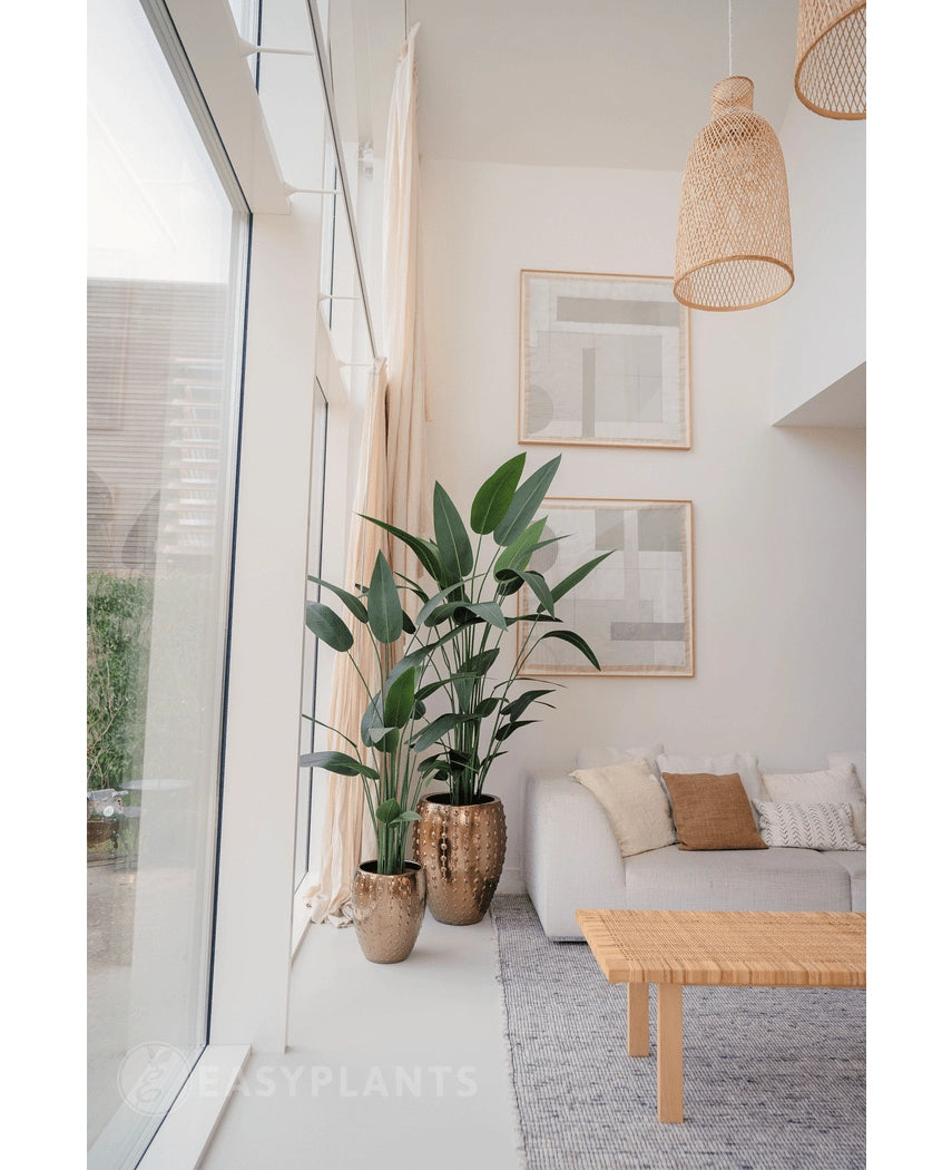 Grote planten in een ruimte brengen een luxe sfeer. Deze prachtige Heliconia kunstplant is een geweldige optie om meer sfeer en gezelligheid in een ruimte te brengen. Hij is maar liefst 210cm hoog, waardoor hij ook diepte toevoegt en de ruimte optisch groter maakt. Ideaal om een lege hoek in huis mee te decoreren.