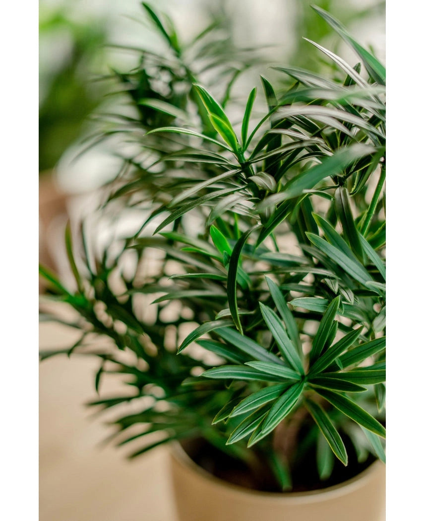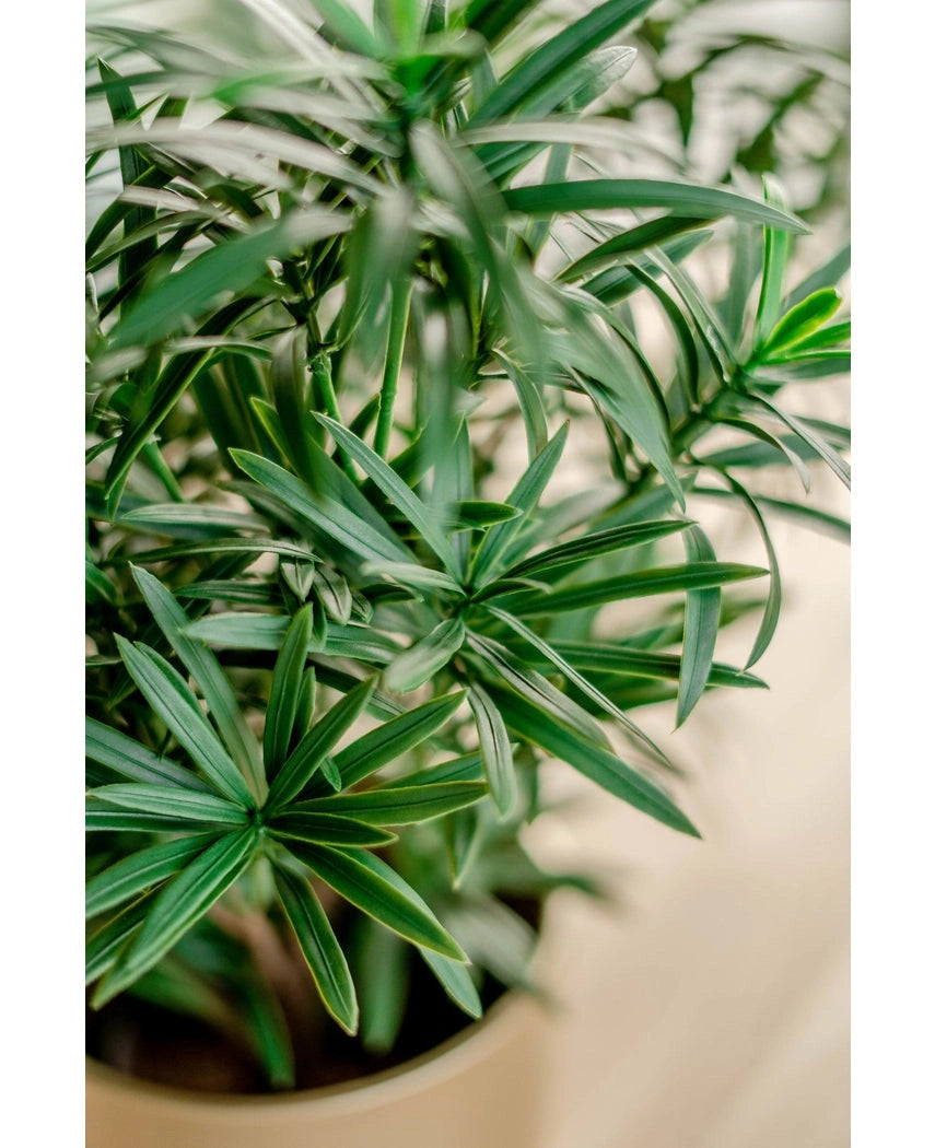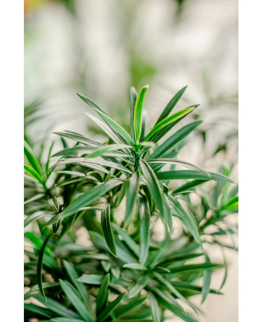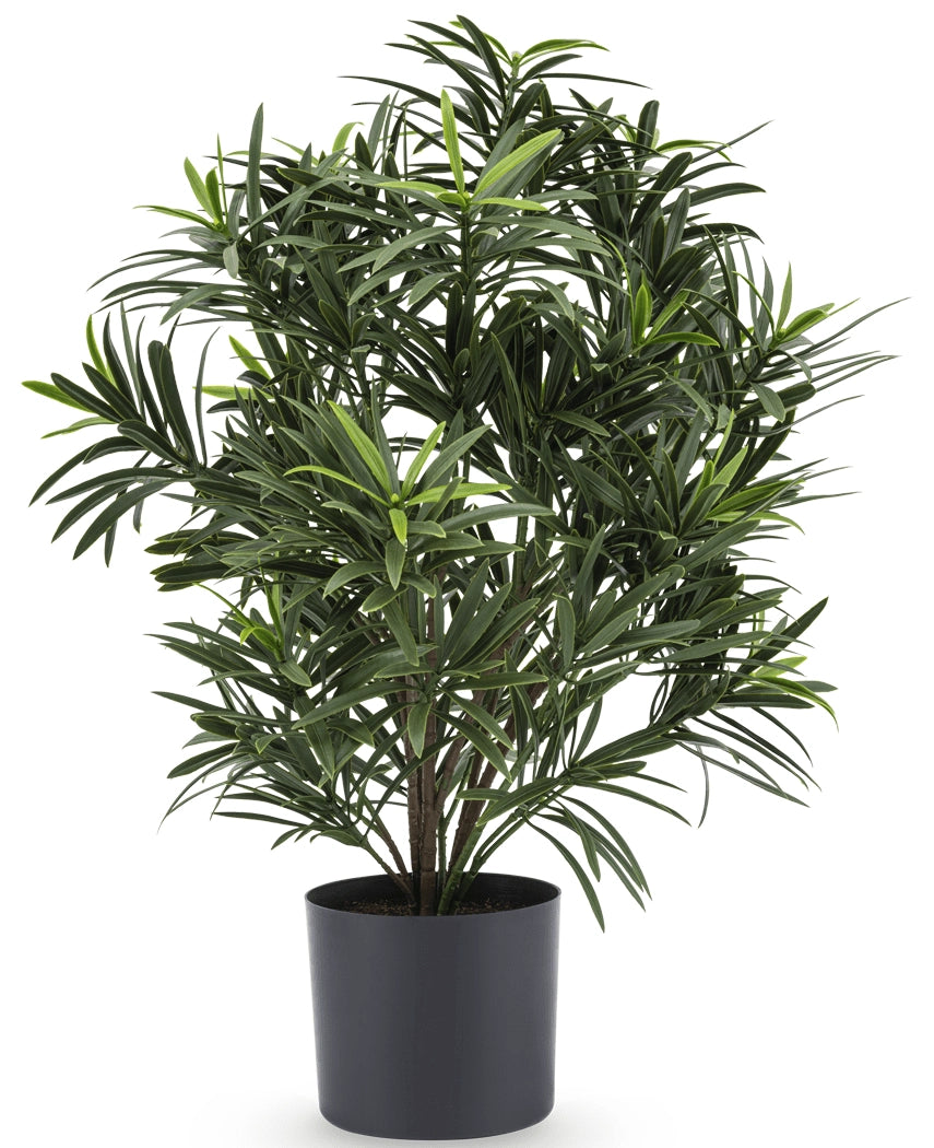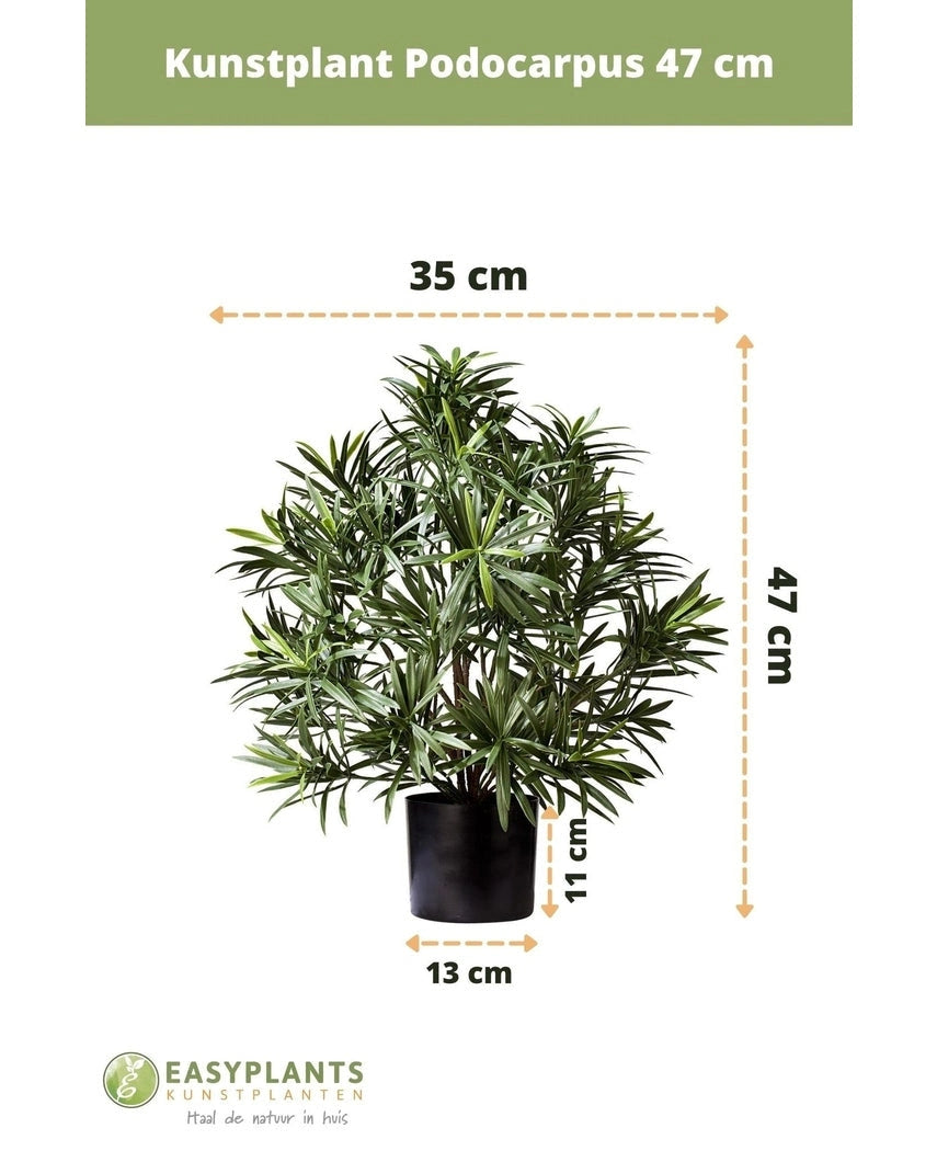 Deze lage kunstplant, de Podocarpus is uitermate geschikt om als kamerplant te houden. Doordat deze maar een hoogte van 47 cm heeft, is deze makkelijk overal te plaatsen. De Podocarpus is familie van de conifeer en dat voel en zie je ook terug in de blaadjes van deze kunstplant. De blaadjes zien en voelen leerachtig aan met diepgroene, puntige lange blaadjes.