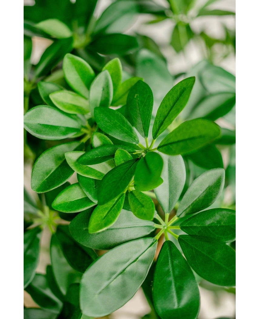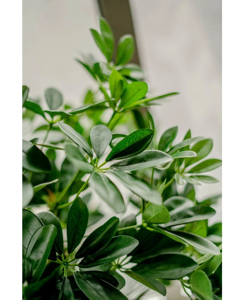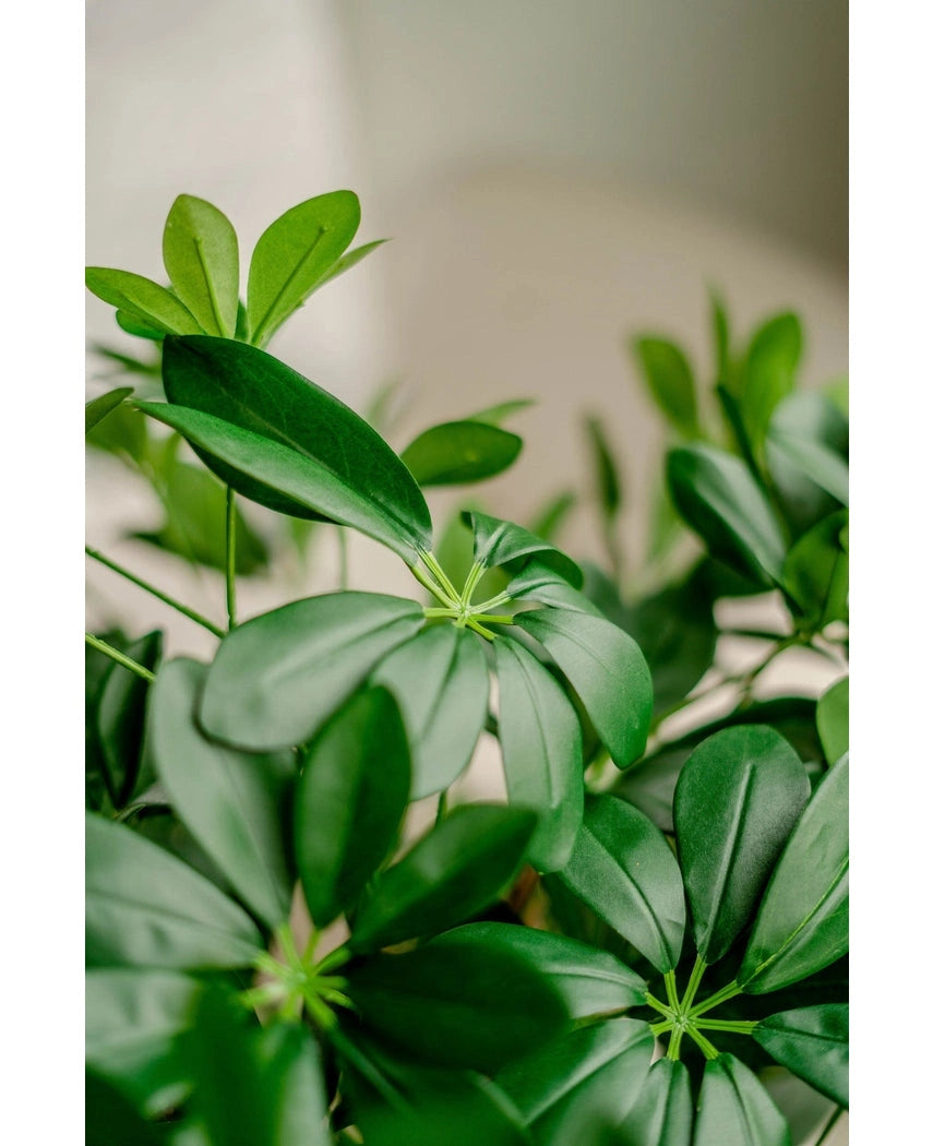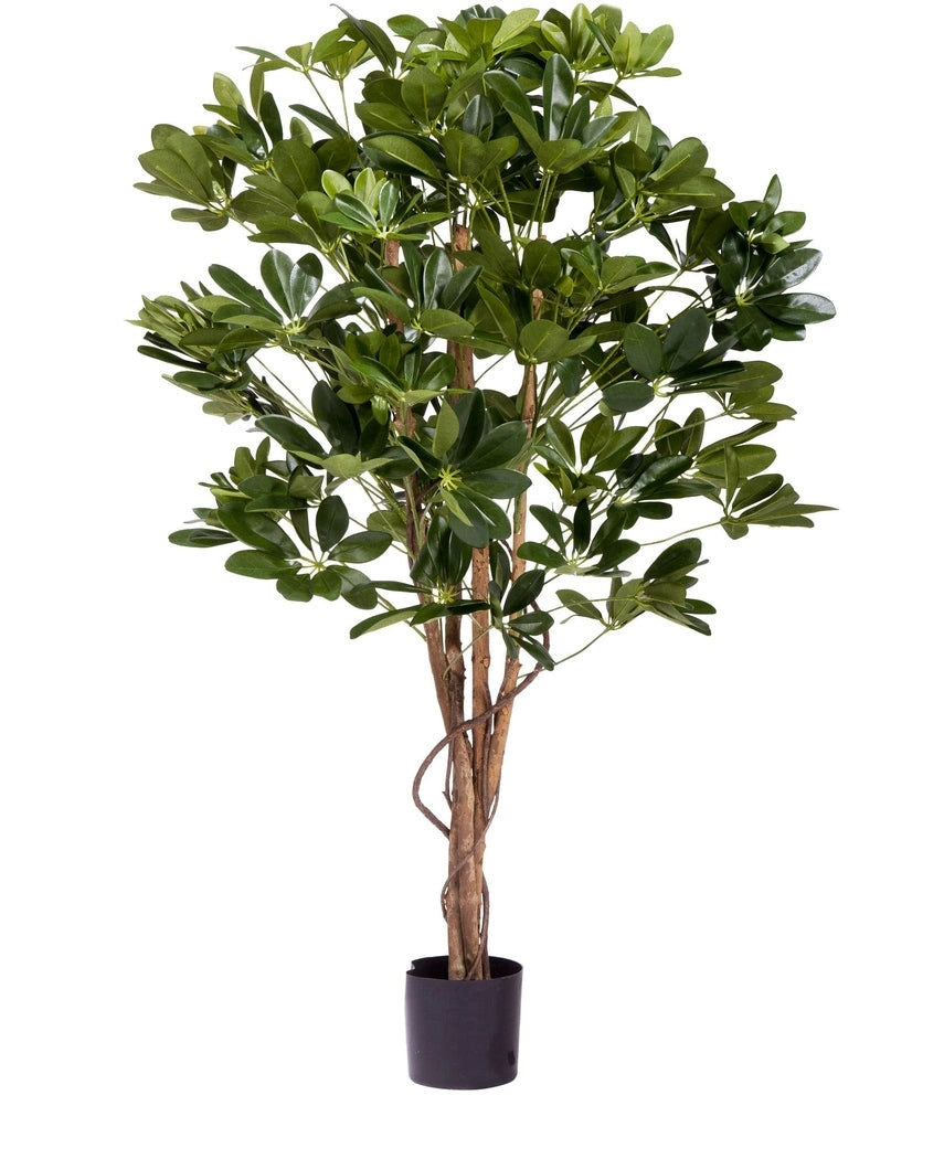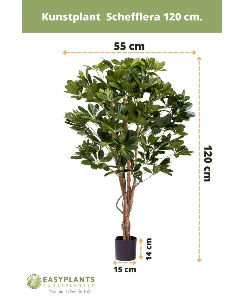De Schefflera is een fraaie plant uit de familie van de klimop en kan in levende vorm maar liefst 30 meter lang worden. Zo hoog is uw plafond vast niet en gelukkig hoeft u zich geen zorgen te maken als u deze prachtige kunstplant Schefflera aanschaft. De groene kunstplant is 1.20m. hoog en gemaakt van hoogwaardig kunststof. Voor een natuurgetrouwe look is gekozen voor een stam van echt hout. De kleine ronde bladeren vormen samen kleine parapluutjes, een mooi plaatje. Leuk in enkelvoud, maar natuurlijk helemaal fraai in meervoud. Bestelt u meerdere van deze blikvangers, dan profiteert u bovendien van...
