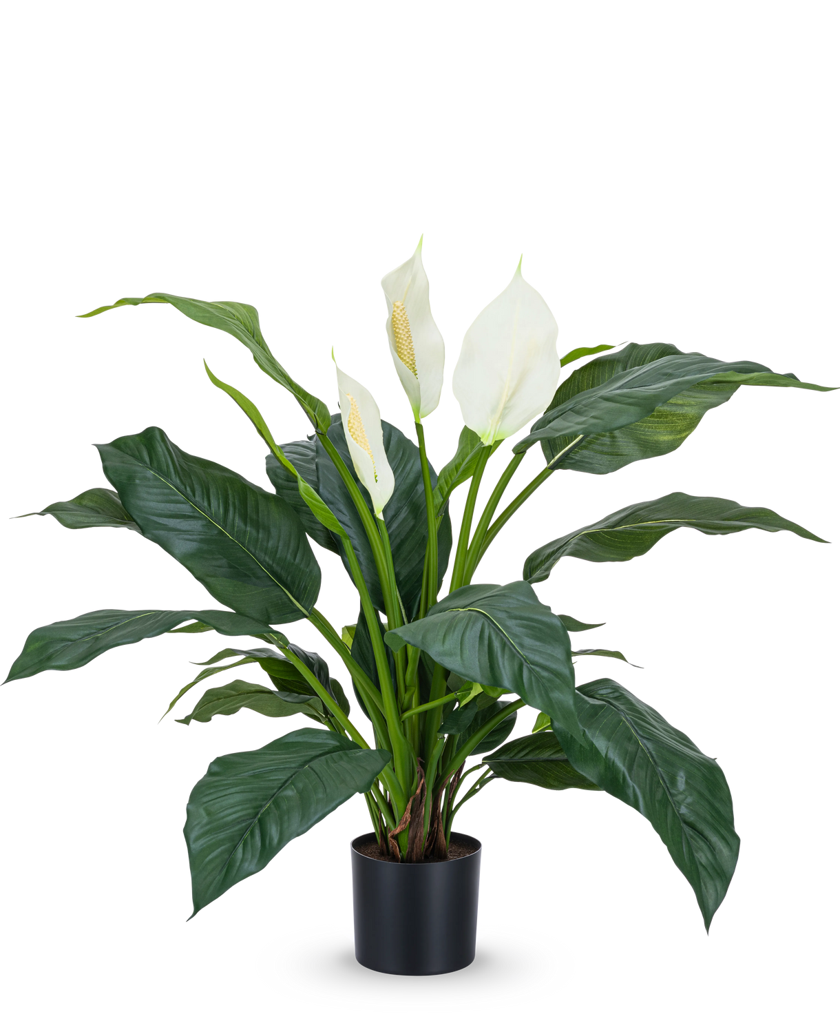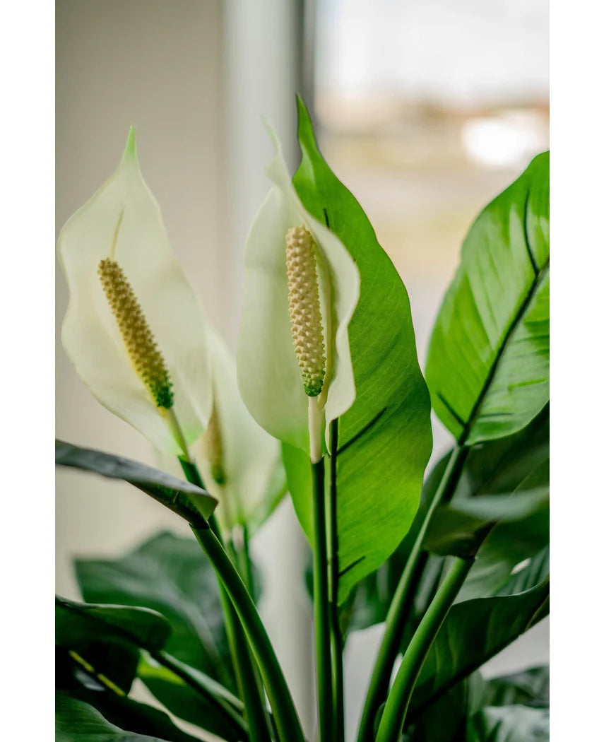 De spathiphyllum is een zeer geliefde kamerplant vanwege de bijzondere witte bloemen die de vorm hebben van een lepel. Vanwege die vorm wordt de plant ook wel de lepelplant genoemd. Het is van oorsprong een tropische plant die gewend is aan hoge temperaturen en daar barst het in Nederlands doorgaans niet van. Daar heeft de Kunstplant Spathiphyllum Wit gelukkig geen last van. Warm, koud, droog of vochtig, u kunt de 74 cm. hoge kunstplant overal binnenshuis neerzetten. Extra leuk natuurlijk in een mooie hoge design sierpot en in meervoud. Schaft u er meerdere tegelijk aan dan bespaart u tot wel...