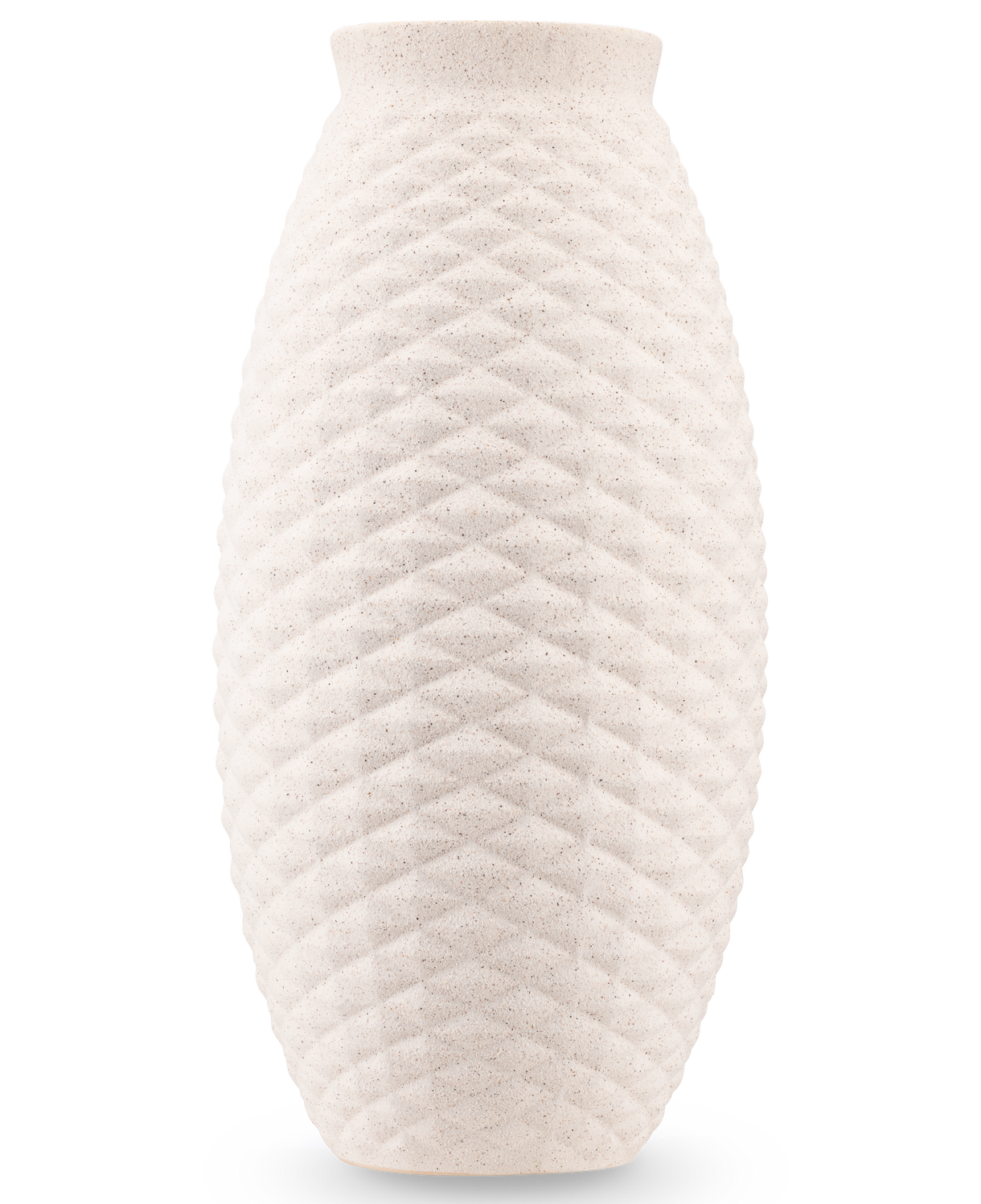 Strak, elegant en vol karakter: de Vessel vaas is een statement piece dat rust en verfijning uitstraalt. Met haar royale hoogte van 33 cm en zachte beige kleur vormt ze een indrukwekkende basis voor een groot zijden kunstbloemen boeket. De keramieken afwerking geeft haar een natuurlijke, matte look die moeiteloos past in moderne en minimalistische interieurs.