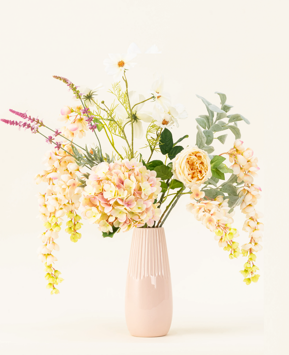 De sierlijke Wisteria in crème vormt een elegante eyecatcher, terwijl de witte Cosmos en paarse Lavendel zorgen voor een frisse, zomerse noot. De Eucalyptus brengt structuur en een vleugje groen,...