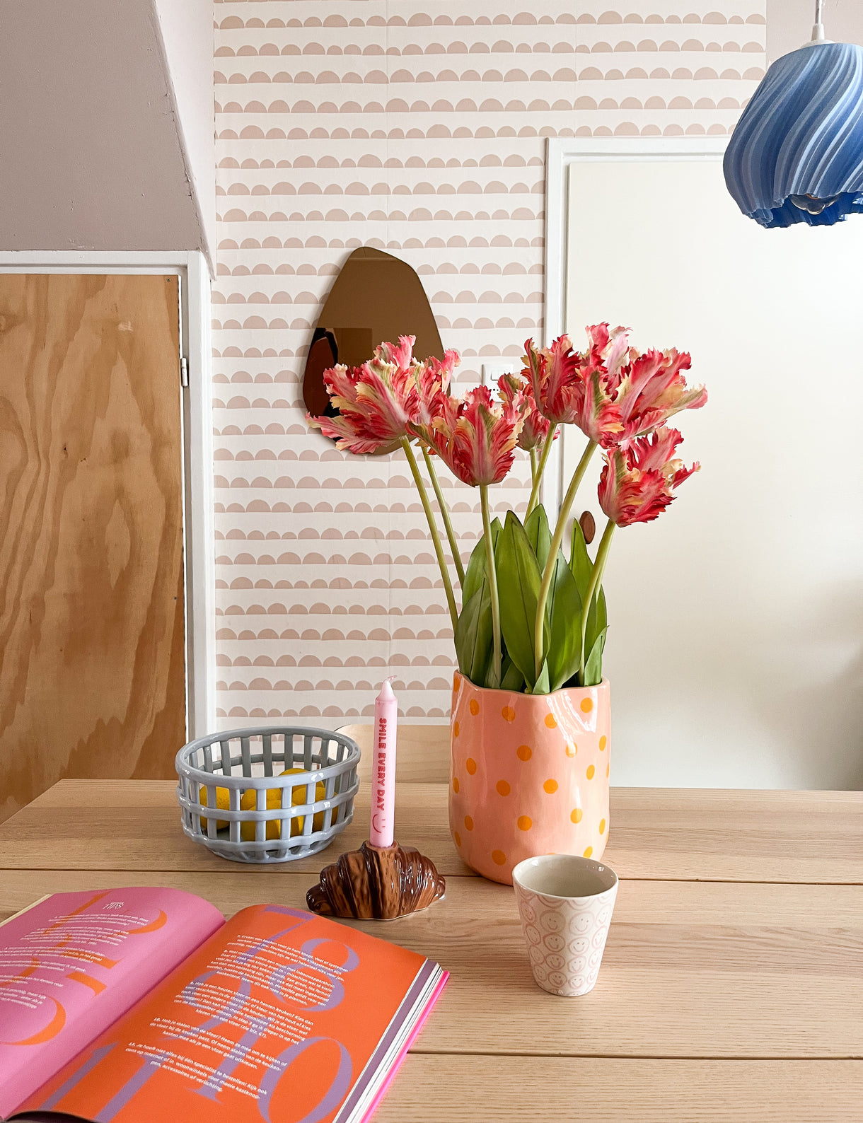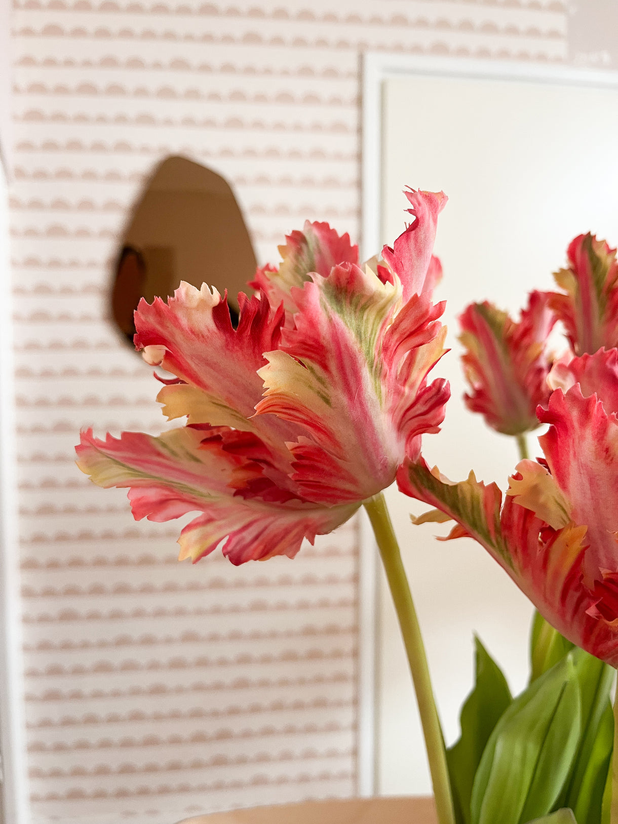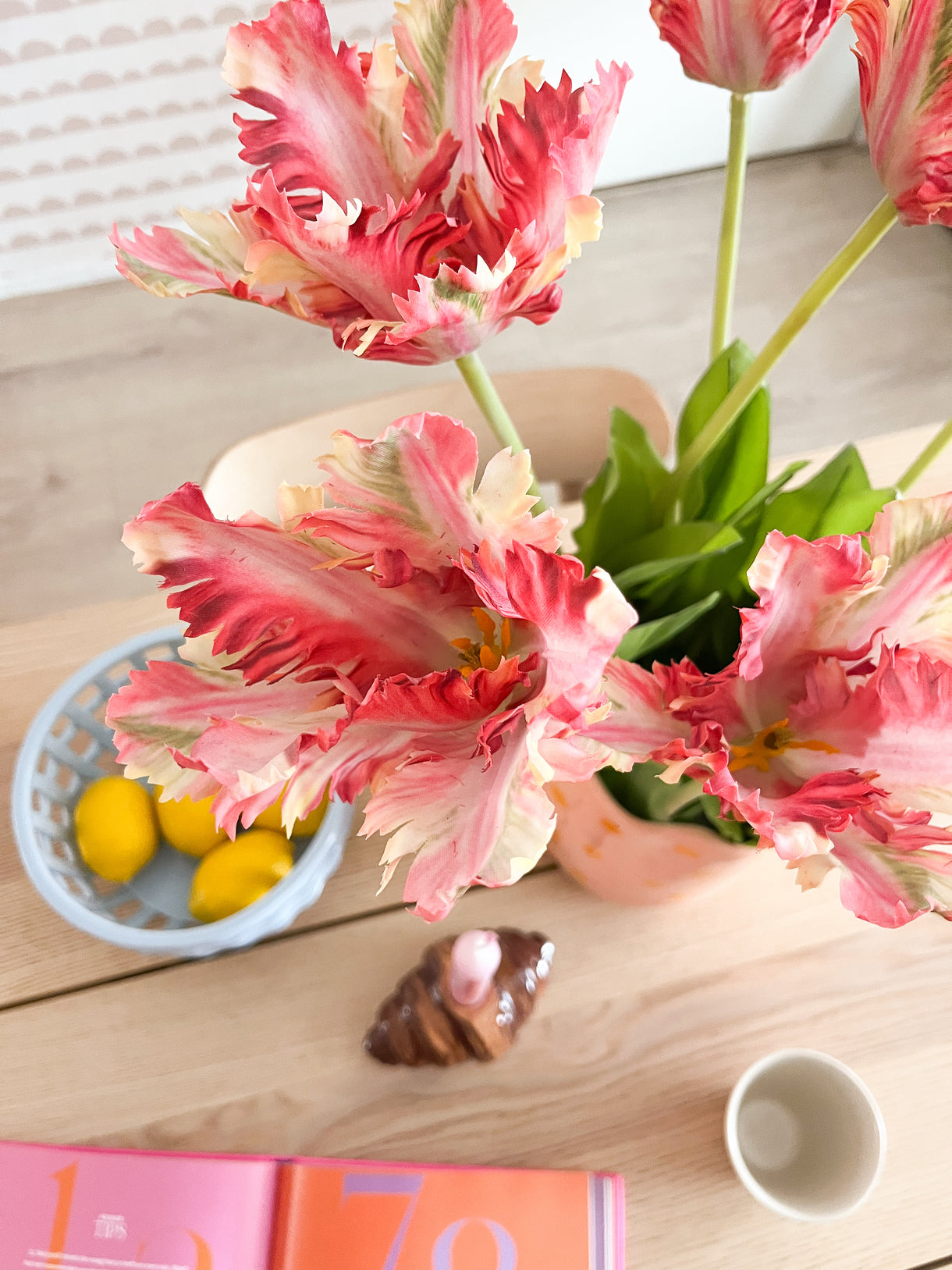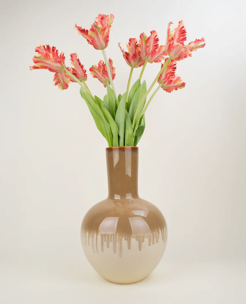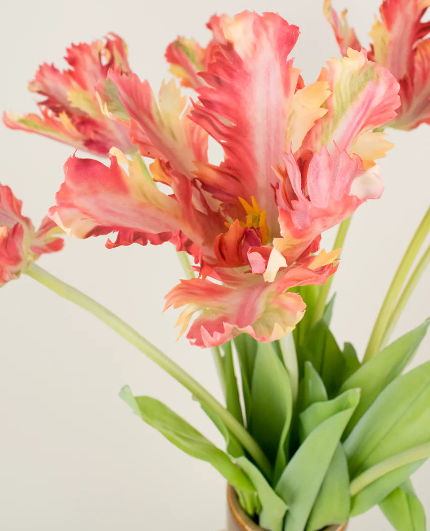 Haal de lente in huis met het zijden kunstbloemen boeket Franse Parkiet Tulp rood/geel, bestaande uit acht indrukwekkende stelen. De kenmerkende vlammen van rood en geel op de unieke parkiettulpen zorgen voor een levendig en expressief boeket dat direct de aandacht trekt. Dit boeket ademt flair – ideaal voor wie durft te kiezen voor kleur en karakter.