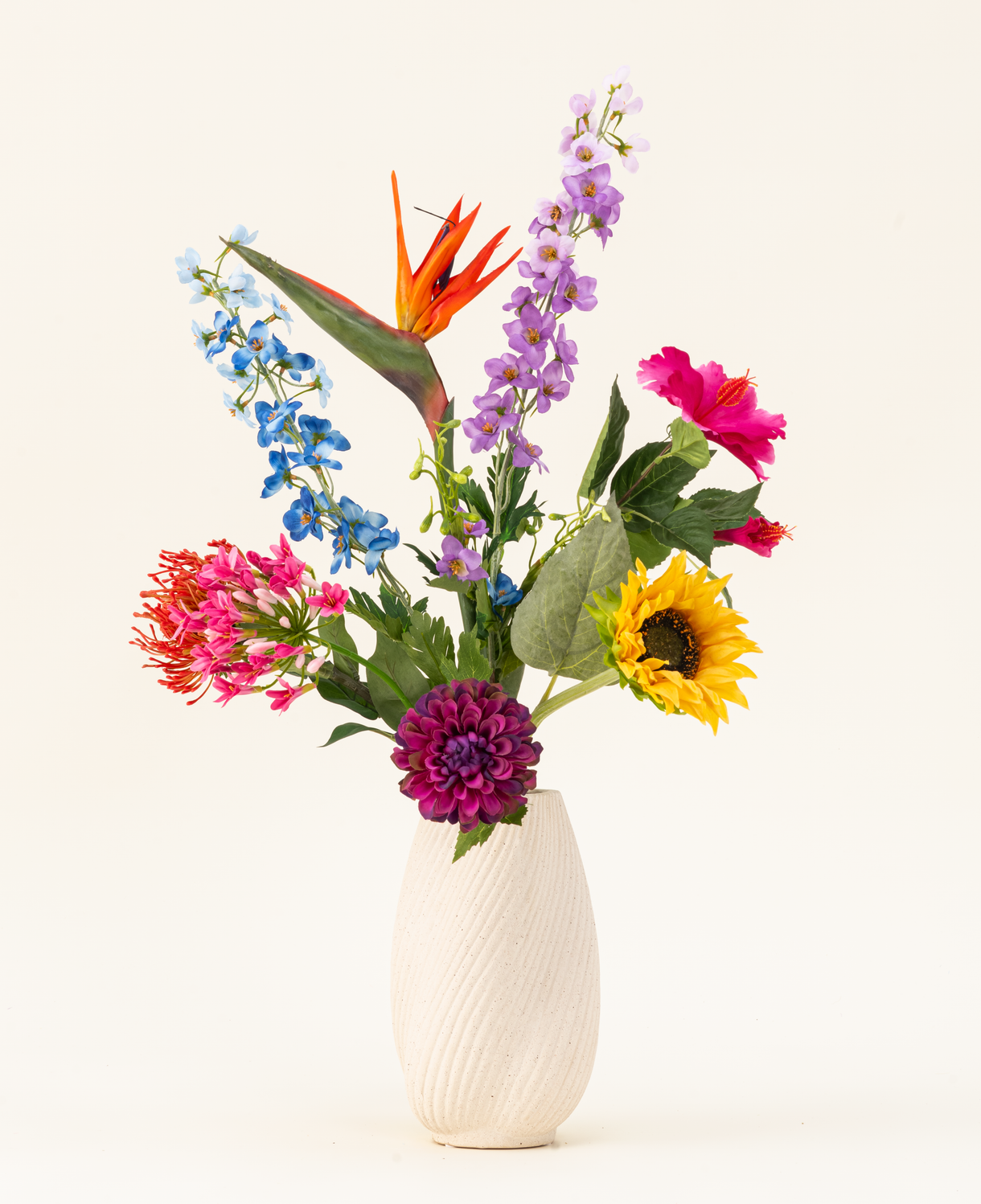 Stap in een harmonieuze bloemenwereld met het zijden boeket Garden Melody – een rijk en gelaagd arrangement vol kleur, contrast en karakter. Dit boeket combineert de zachte charme van zomerse bloemen met exotische accenten voor een krachtig, elegant statement in elk interieur.