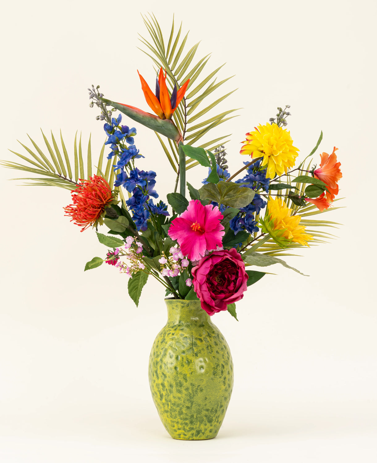 🌺 Exotisch, expressief en sprankelend – Hibiscus Fiesta is een explosie van kleur en karakter. Dit zijden boeket brengt de energie van een tropisch feest rechtstreeks je interieur binnen. De vurige hibiscus in oranje en roze vormen het hart van het boeket, bruisend van vrolijkheid en flair.