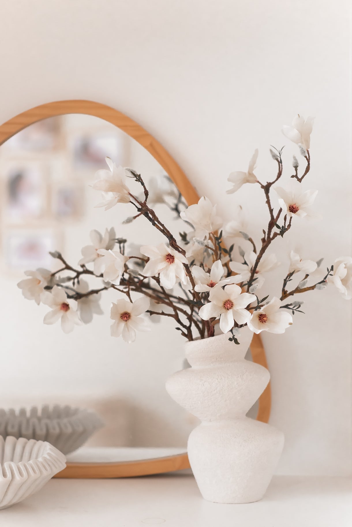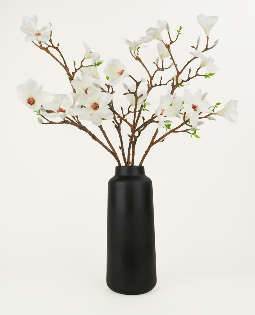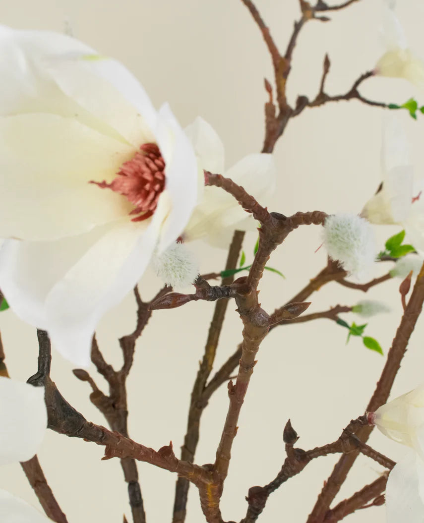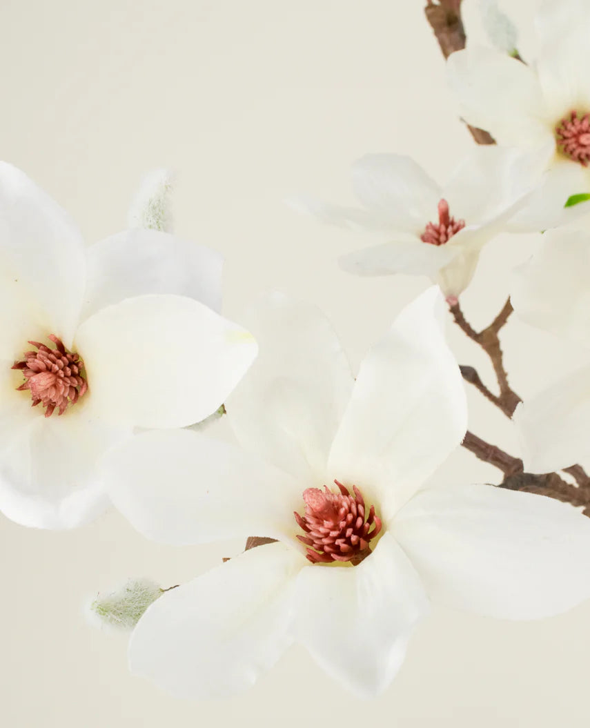 Breng een gevoel van rust en elegantie in huis met het zijden kunstbloemen boeket Magnolia Wit, bestaande uit drie sierlijke stelen. De grote witte magnoliabloemen, met hun zachte bloemblaadjes en levensechte details, zorgen voor een serene en luxueuze uitstraling die past in elk interieur.