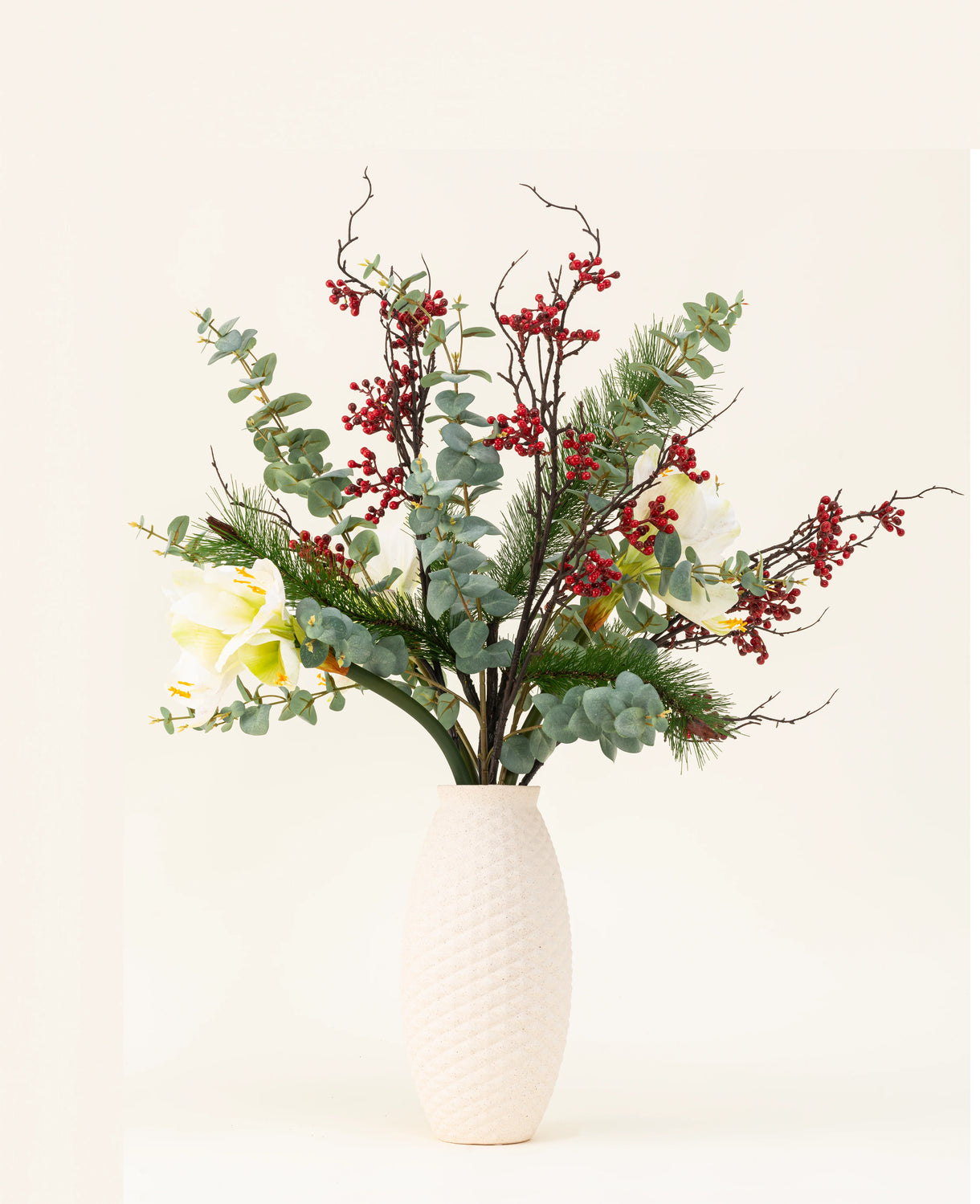 De witte amaryllis vormt het serene middelpunt en geeft het boeket een pure, elegante uitstraling. De rode bessen voegen een feestelijke en levendige noot toe, terwijl de dennentak zorgt voor natuurlijke diepte en een robuuste basis. De eucalyptus maakt het geheel af met frisheid en een moderne groene toets.