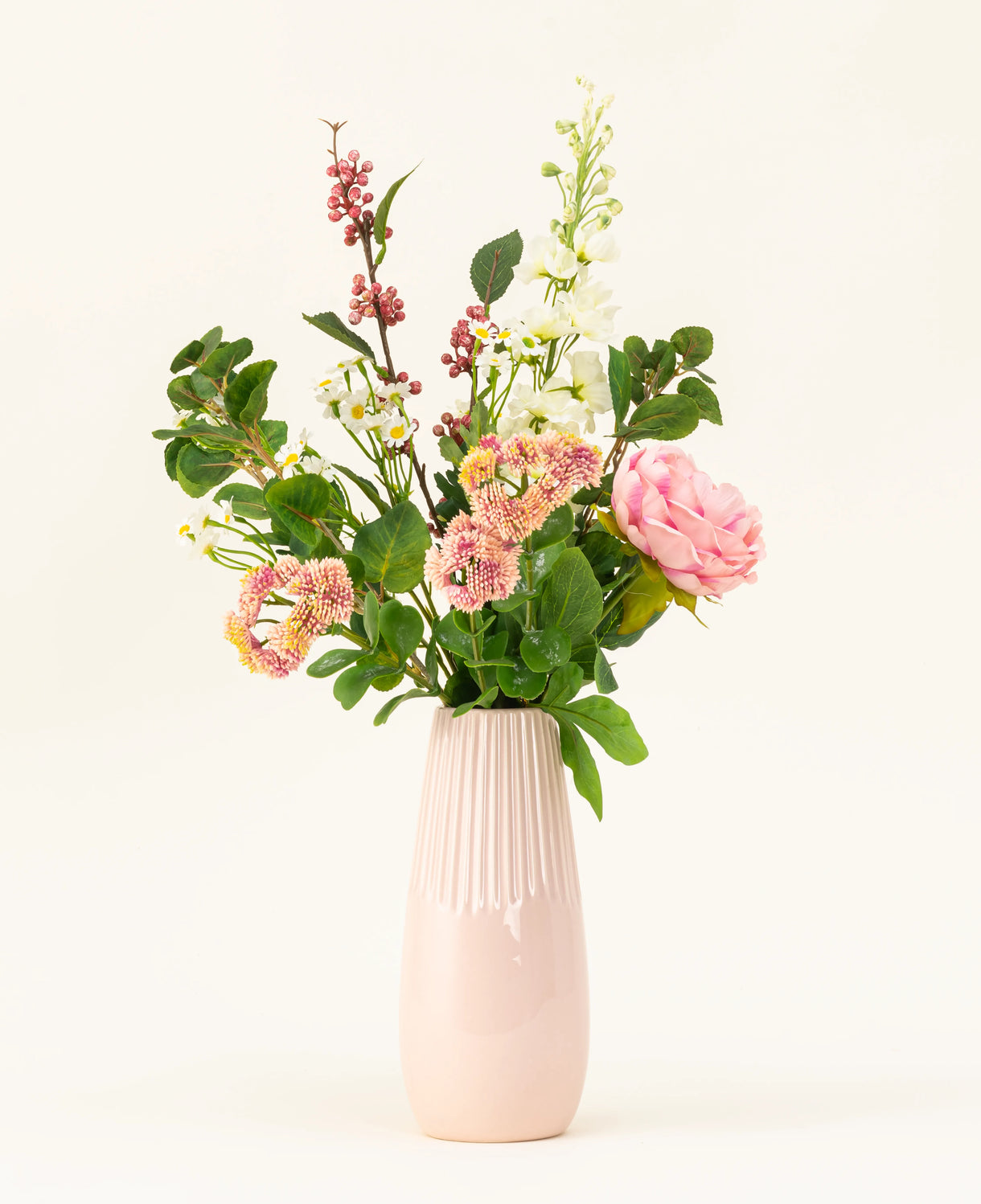 Daisy Charm is een zijden boeket dat frisheid en natuurlijke elegantie samenbrengt. Met een harmonieuze mix van roze, wit en groen straalt dit arrangement zachtheid en levendigheid uit. Perfect voor wie houdt van een frisse, romantische uitstraling en een tijdloze decoratie die warmte én verfijning brengt.