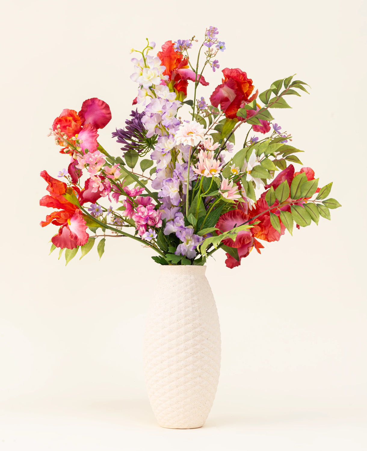 Pink Pop is een explosie van kleur, energie en vrolijkheid in de vorm van een zijden boeket. Met een speels palet van roze, rood, paars en wit brengt dit arrangement een frisse en levendige sfeer in elke ruimte. Ideaal voor wie houdt van expressieve bloemen, dynamische vormen en een decoratie die meteen de aandacht trekt.